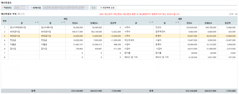 [회계보고] 2026년 늘푸른집 예산 공지 페이지 정보 작성자 늘푸른집 댓글 0건 조회 6회 작성일 25-12-24 16:51 목록 본문 사회복지 재무 회계 규칙 제10조 4항에 근거하여 2026년 늘푸른집 예산을 공지합니다. 다음글[회계보고] 2025년 늘푸른집 제 3차 추가경정 예산서 공고 25.12.24 댓글 0 댓글목록 등록된 댓글이 없습니다.
