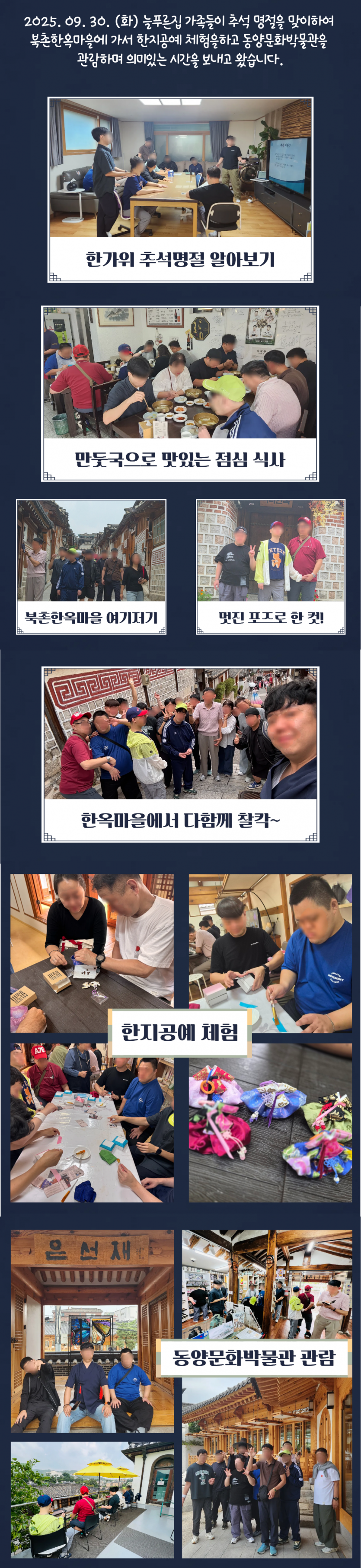 2025년 늘푸른집 추석명절을 맞이하여 체험활동으로 북촌한옥마을을 방문하여 한지공예 체험 및 동양문화박물관을 다녀왔습니다.